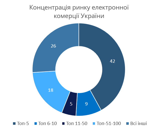 Таким чином можна визначити, що ринок е-коммерц України характеризується високим рівнем концентрації. Більше 50% клієнтів залучають лише топ-10 лідерів ринку. Це свідчить про високий рівень труднощів у просуванні нових онлайн-магазинів.