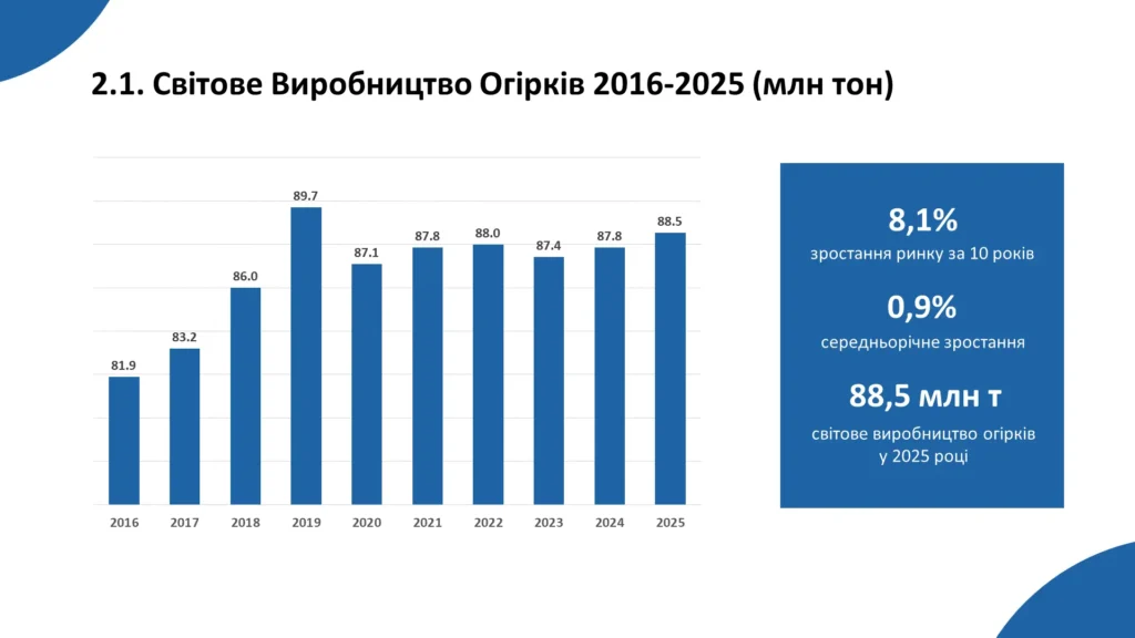 Аналіз світового ринку огірків демонструє поступове зростання галузі протягом останніх 10 років, у результаті чого обсяги виробництва збільшилися приблизно на 8% і досягли близько 88 млн тонн. Ринок розвивається завдяки стабільному попиту на свіжі овочі, а також активному впровадженню тепличних технологій у провідних країнах.